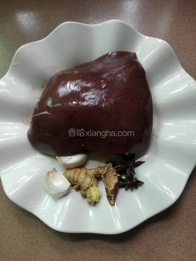 3.然后把焯过水的猪肝捞出放姜、蒜头、八角、酱油和猪肝一起放锅里卤四十五分钟。