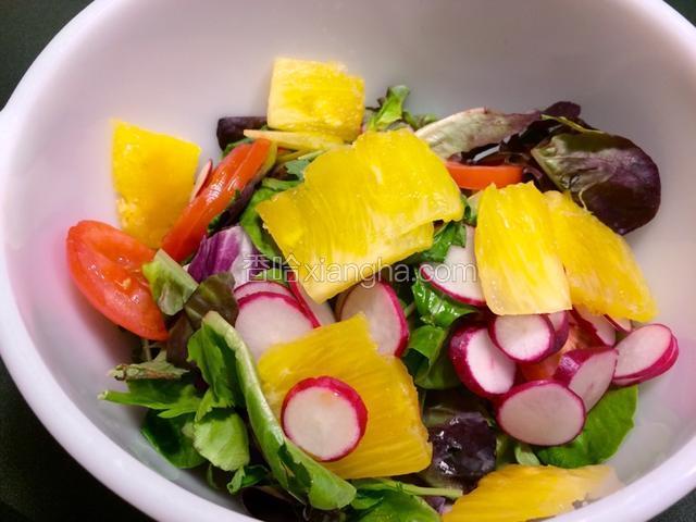 6.加入刚做好的沙拉酱,与所有食材混合拌匀;