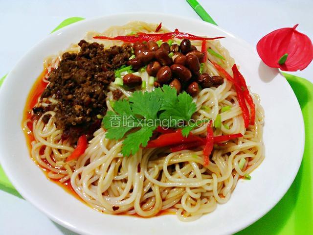 5.煮好的米线拌匀,放入油酥花生米,红椒丝,肉酱,香菜就可以了,