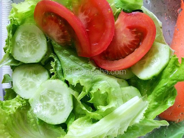 4.生菜撕开小块,西红柿切块,再切几片黄瓜,摆在喜欢的容器里面(沙拉盘)