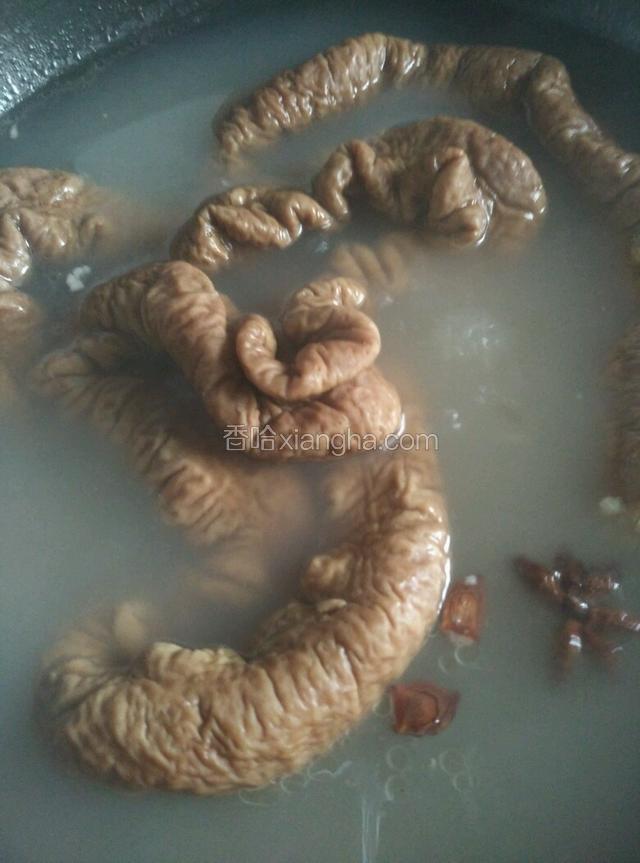 1.自己实在不愿做,买熟的肥肠,担心卫生和熟的不太烂,所以买回来自己又煮了一个小时,加入水,白糖,料酒,花椒大料葱姜蒜。