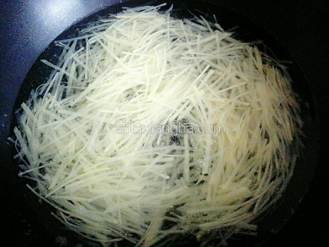4.给锅里加点凉水,大火烧开后,把土豆丝倒进锅里焯二十秒左右。
