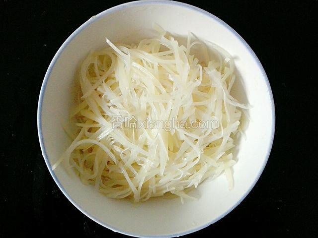 3.把土豆切成丝,放清水里多清洗几遍,去除土豆丝里的淀粉。