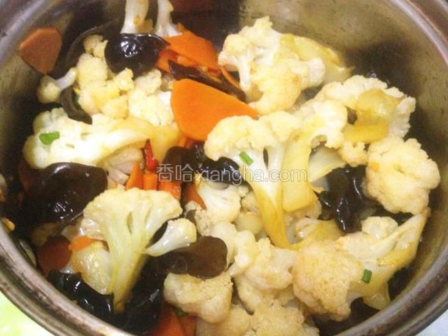 2.花菜切小块,用盐水浸泡10分钟,洗净沥干备用.
