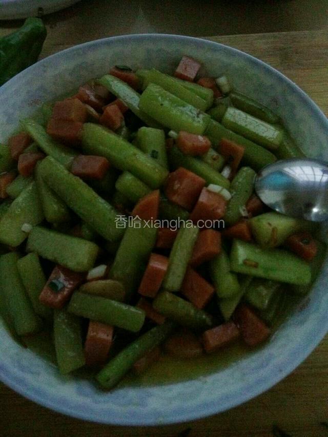 4.倒入切好的黄瓜条(因为黄瓜生吃都可以)所以翻炒一小会就倒入火腿肠丁一起翻炒下,放入盐、鸡精、白糖、鸡粉、倒入少许酱油,点缀一下颜色,最后洒山