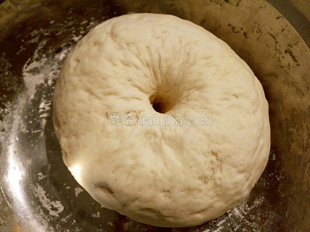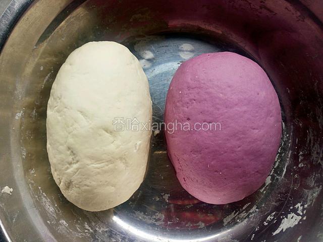 6.另取一个盆子倒入白面粉,加入白糖,倒入剩下的化开的酵母,加适量温水揉成光滑面团。两块面团都盖潮布放温暖处发酵。