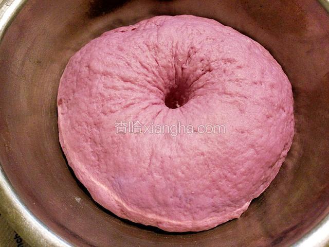 5.找个大点的盆子,加入紫薯泥和面粉,倒入一半化开的酵母,加适量温水揉成光滑面团。(紫薯本身有甜味,这里的白糖可加也可不加,喜甜就加一点。)