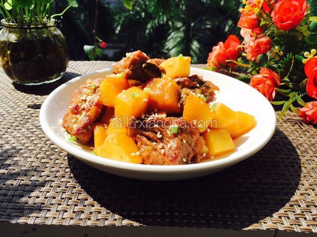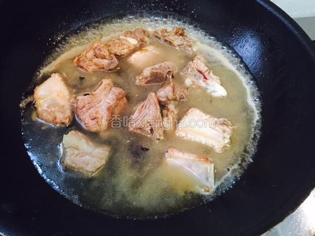 5.排骨放沸水里煮两分钟捞起滴干水分 炒香大料姜蒜葱再放排骨爆炒 此时放入生抽 白糖 盐 米酒