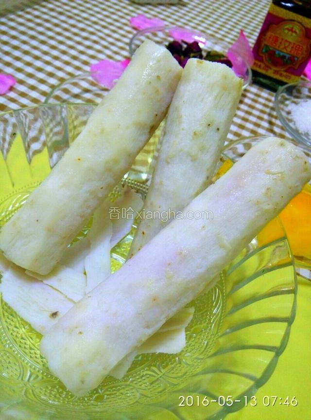 4.把圆柱体的山药最大限度的切成长方体,然后,一剖四条切成约1厘米见方的长约10厘米的条16个。