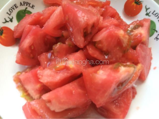 2.两个西红柿,当然大个的一个就可以,西红柿划十字,开水烫去皮