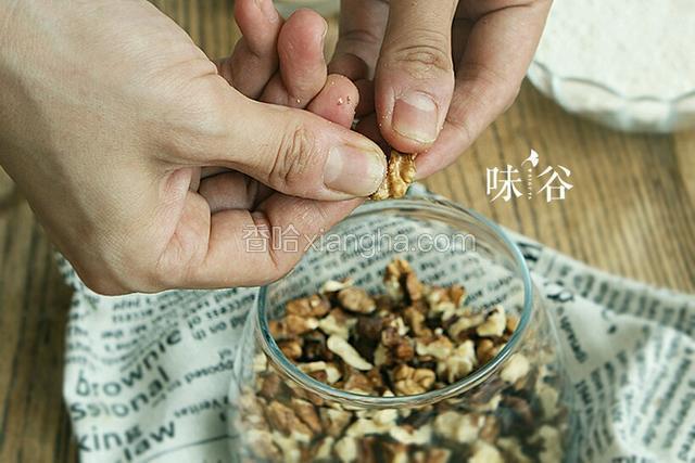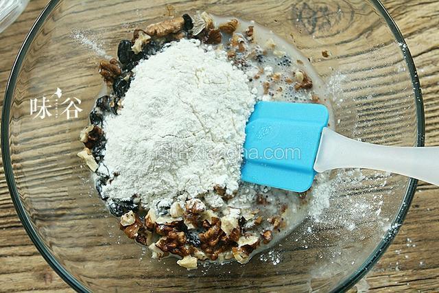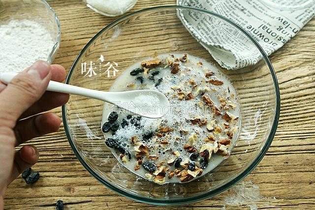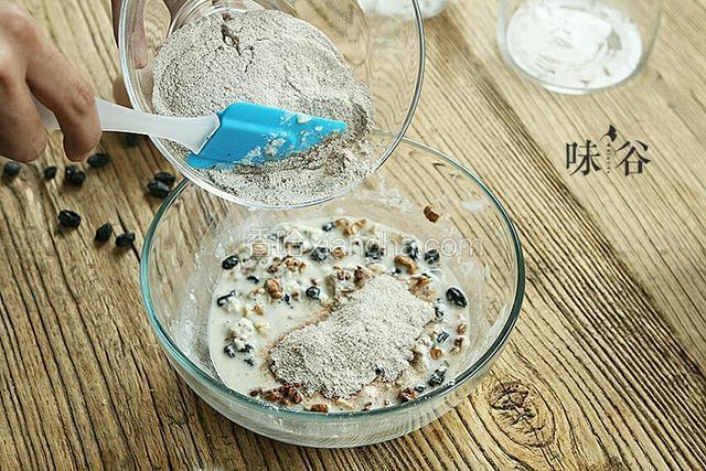 5.核桃,葡萄干,一点点盐混合在一起,倒入发酵好的酵母水搅拌均匀 。