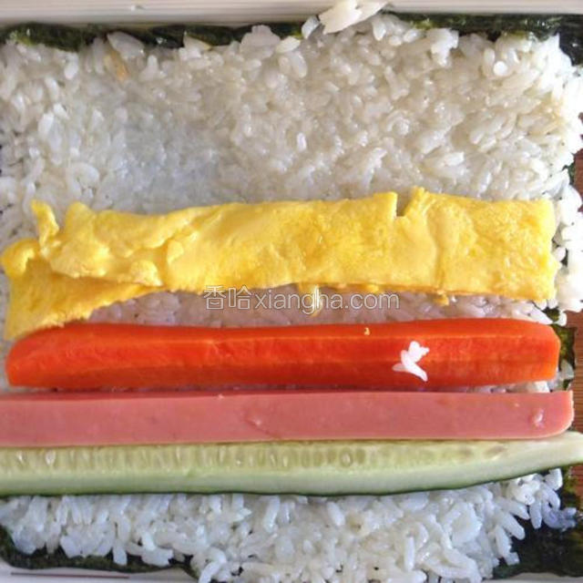 2.米饭煮好以后盛热放入盆里,放点鸡汁,芝麻油,盐搅拌均匀,取竹帘铺上一张紫菜把米饭均匀的抹平紫菜上,然后把切段的青瓜,火腿,胡萝卜,鸡蛋摆在米饭上卷起来