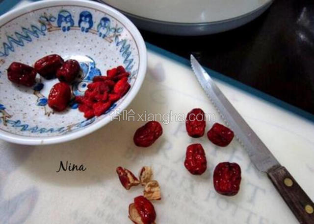 4.红枣清洗干净切丁去核,连同枸杞一起放入锅中。