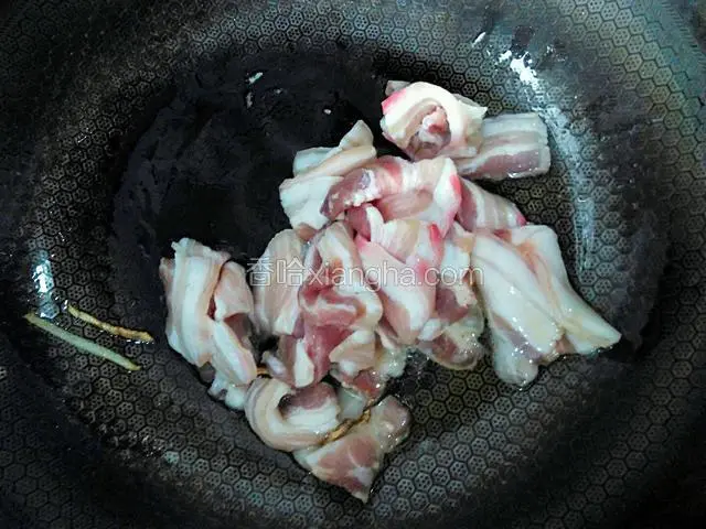 5.快速翻炒均匀,炒至五花肉变白打卷。