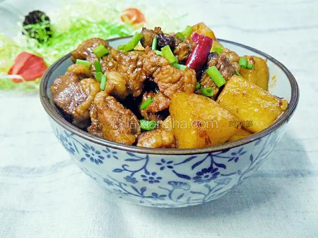 2.将土豆去皮切成滚刀块,可放入水中浸泡防止氧化。五花肉切成薄片,生姜切丝,香葱切葱花。