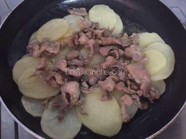6.炒至土豆片变色变软时加入猪肉翻炒片刻