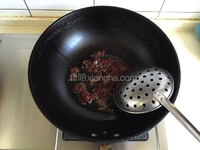 2.锅中倒油,放入郫县豆瓣酱与其融合。