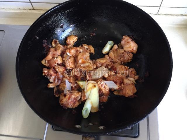 3.鸡块倒入锅内,翻炒1分钟。(鸡腿提前切块反复浸泡血水。)