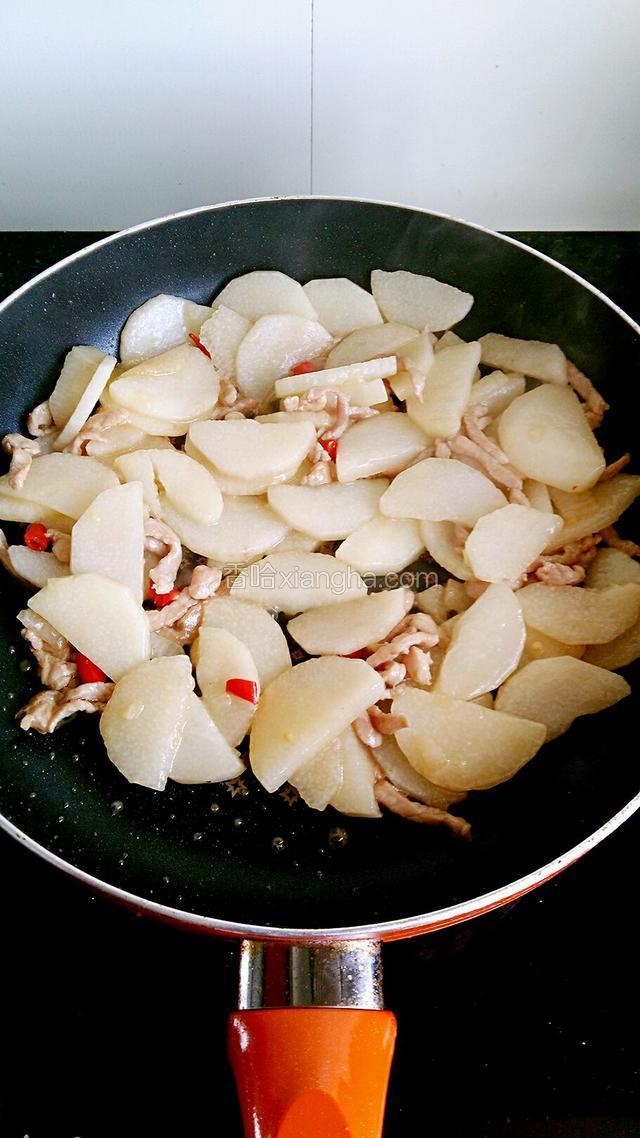 5.热油锅,倒入米椒碎和肉丝中火翻炒至肉丝散开。