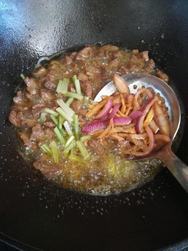 5.先把肉切成一厘米厚的片状,然后再切成条状