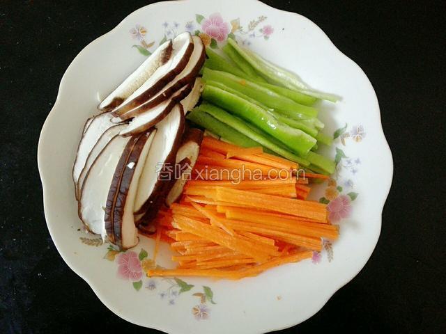 2.把青椒切丝,胡萝卜切丝,香菇切丝,放盘子里备用。