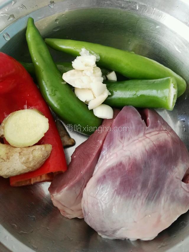 1.准备好所有食材,猪心去掉里面的血块再洗净,辣椒洗净切去蒂。