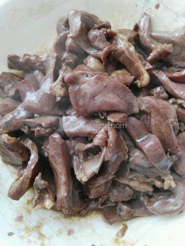 4.猪心全部切好后放到一个碗里,加入生抽,老抽,蚝油,五香粉,一起拌匀放一会儿,入味后热锅倒入油,再倒入腌好的猪心一起大火炒。