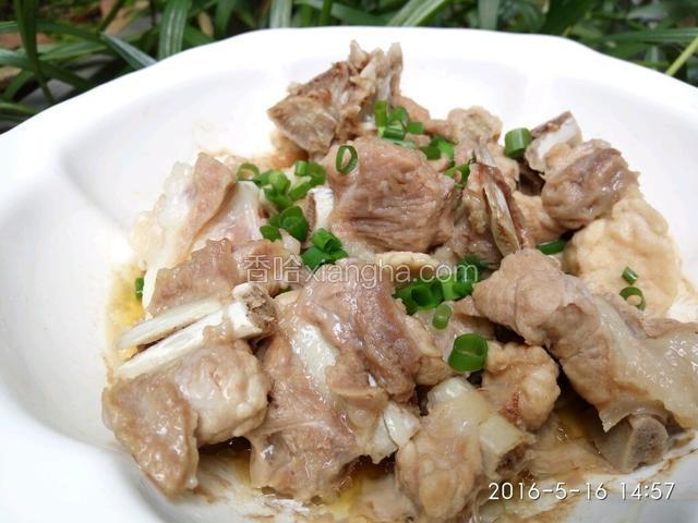 清蒸清蒸,就真的什么都没放就蒸,姜片也没有放,为的就是吃原味。排骨浸泡去除了血水,再加上料酒,就没有腥味了。排骨最好买那种骨头是渣骨的那种,一咬,里面鲜美的汤汁充满整个口腔,让人特别满足,肉都不够它好吃!料酒不能放太多哦,最多就一瓶盖了,多了蒸熟的时候也有料酒的味道,香味不大好!还有,葱是装饰的哦!