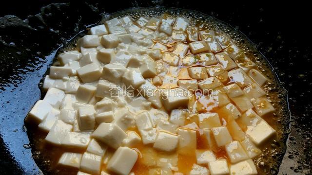 1.内脂豆腐撕去封膜用刀托着反扣在菜板上,用刀划破包装盒底部,除去保装。
