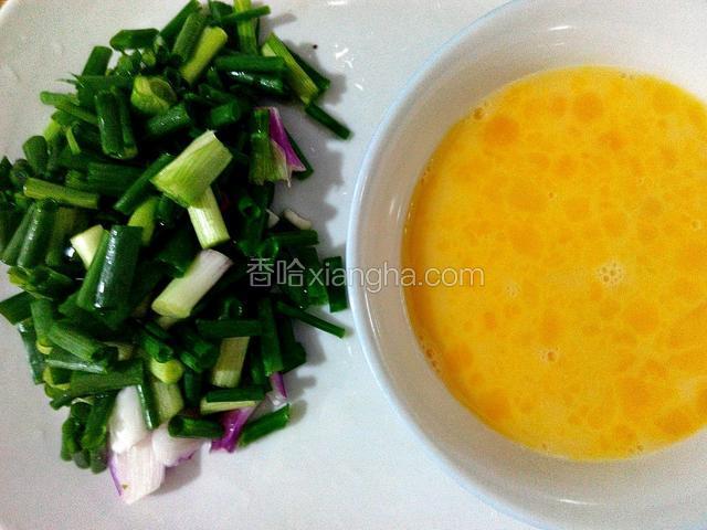 3.鸡蛋打入碗里、放盐、搅拌成蛋液、葱清洗干净、切成葱花