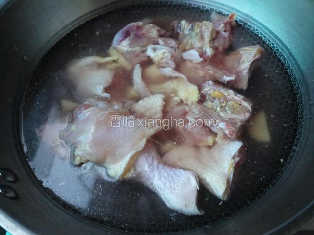 4.坐锅加凉水,加姜片、少量葱段和1勺料酒,下入切好的鸡块焯水;开锅捞出浮沫,再焯2分钟后关火,捞出鸡块用温水冲净。