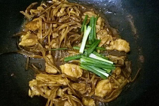 6.加入黄花菜,倒入2汤匙水中火翻炒。