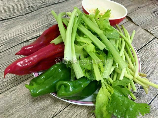 2.准备食材,如图所示。芹菜少许,蒜薹少许,青椒两个,红椒两个。大蒜少许,土豆半个。