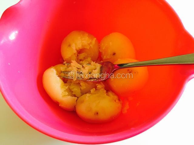 4.煮好的土豆去皮,用叉子压成碎末,不要压成泥状,留些小块儿,这样口感更好