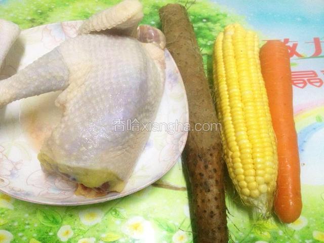 2.老鸡切大块,红萝卜、山药去皮切块,玉米切块.