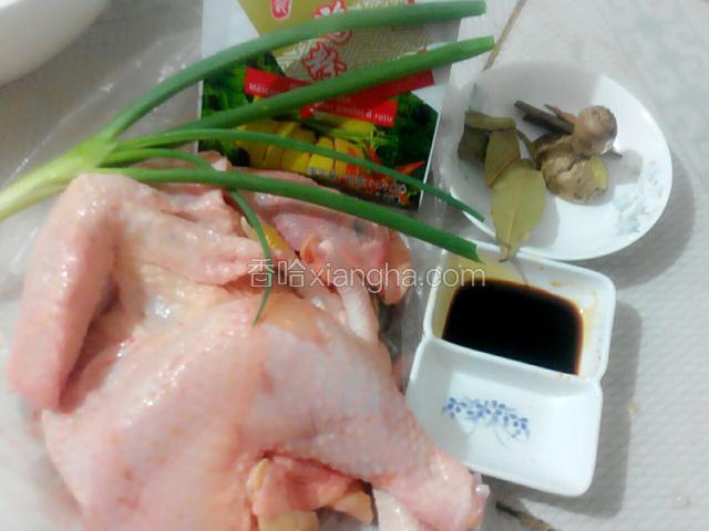 2.把鸡洗干净,葱姜切小,桂皮,香叶,酱油,盐焗粉一起腌制,