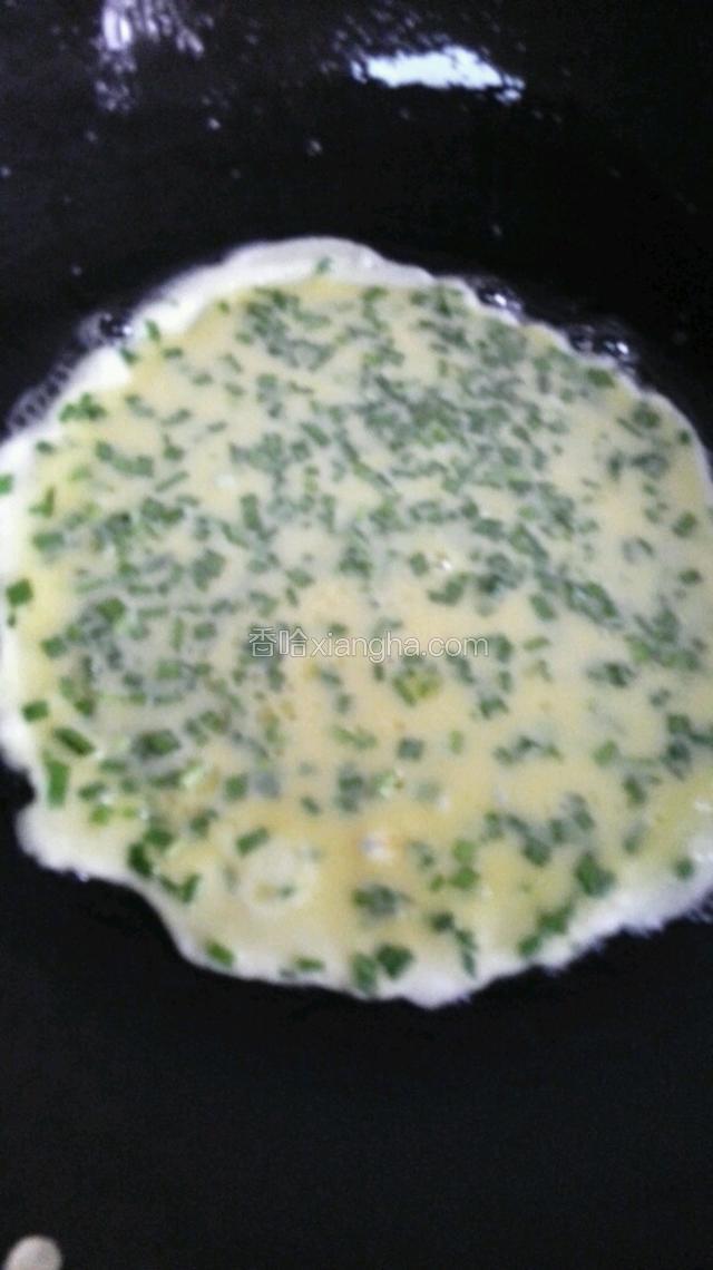 4.锅中放油,油热之后倒一勺面粉糊,晃动锅,使面糊均匀。起泡之后翻面儿