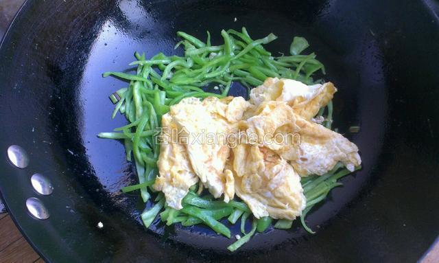 6.看到椒丝微微变软,放一点盐,搅匀,再把鸡蛋放入,大火翻拌均匀