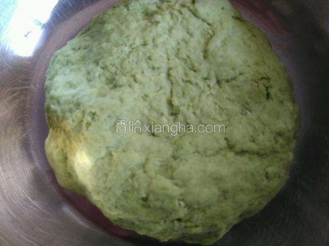 6.把菜汁和酵母同时倒入面粉中