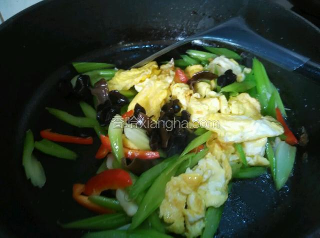 6.放入炒好的鸡蛋以及木耳,放少量盐调味