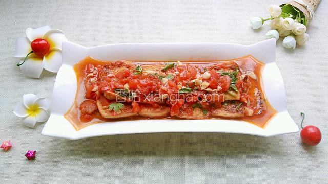 4.煎好的豆腐块用刀切成两半。(切面容易入味)