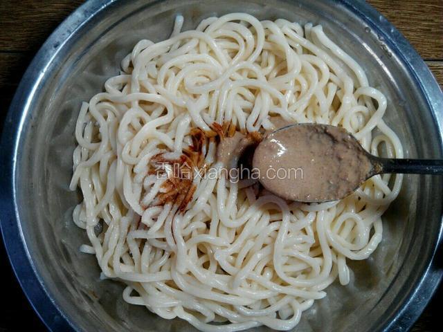 2.芝麻酱放入容器中,兑入清水搅匀。