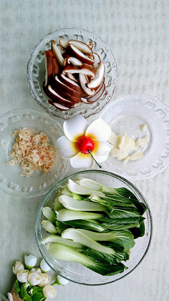 1.香菇洗净切小片,白菜洗净掰成一片片,虾皮用清水洗净后挤干水分,蒜切薄片。