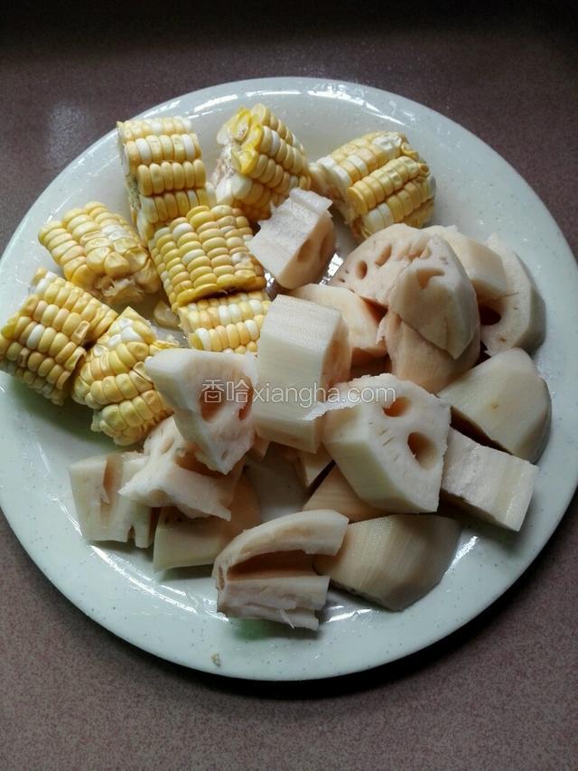 4.高压锅放适量水,把焯好水的排骨、莲藕、玉米放锅里。
