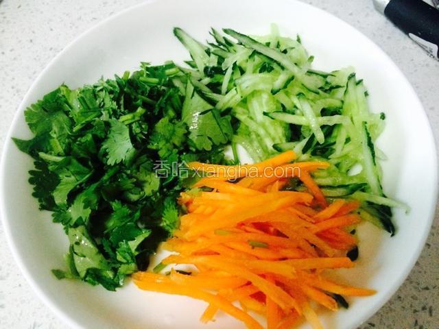 3.黄瓜丝胡萝卜丝香菜末准备好。