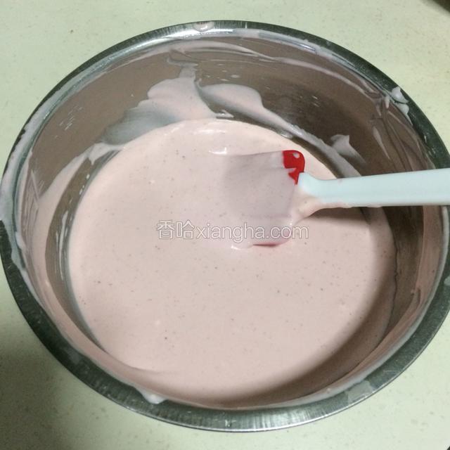 9.每一次翻拌好再加入下一次的蛋白霜的量,蛋糕糊就完成了;