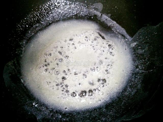 6.锅里倒入纯牛奶、加入白糖(可以多点),把白糖熬化。