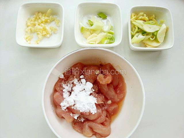 6.将腌肉用料放入肉里拌匀,腌十分钟;葱姜蒜一个、葱蒜一个,还有个蒜切成蒜末