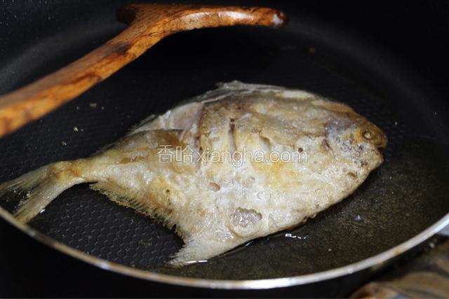 5.平底锅热锅加多点油,能有带鱼厚度的一半,油七成热,将鱼放入煎。一面煎透成形,再翻面煎制。然后盛出沥油。