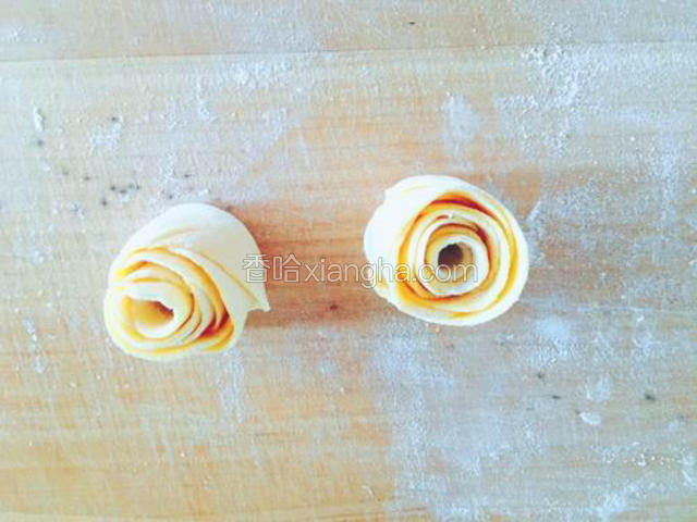 3.先把南瓜发面擀成薄饼,再把白面搓成细条,然后卷起来